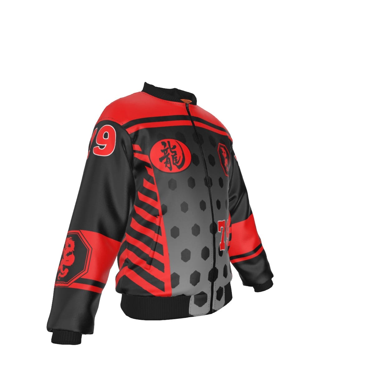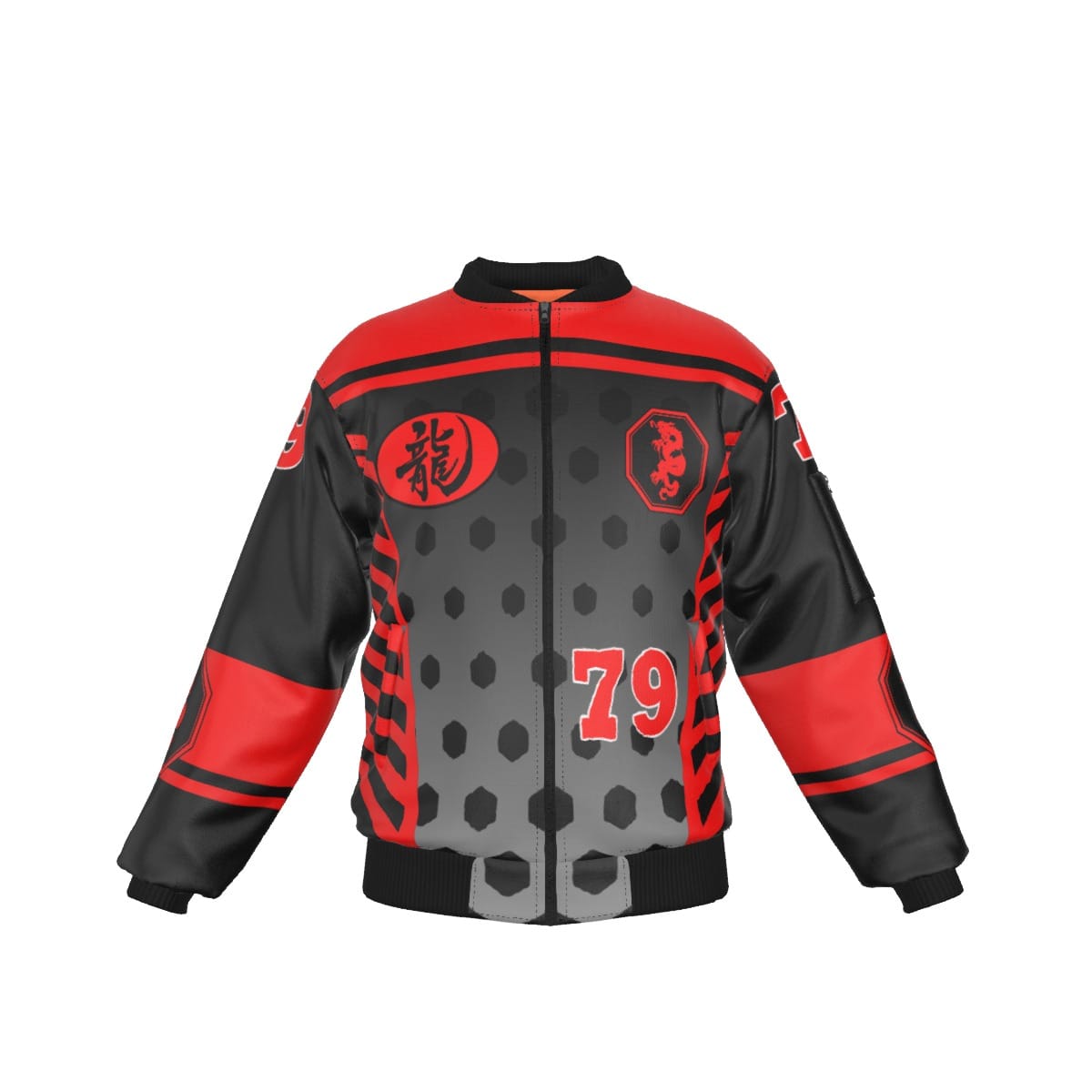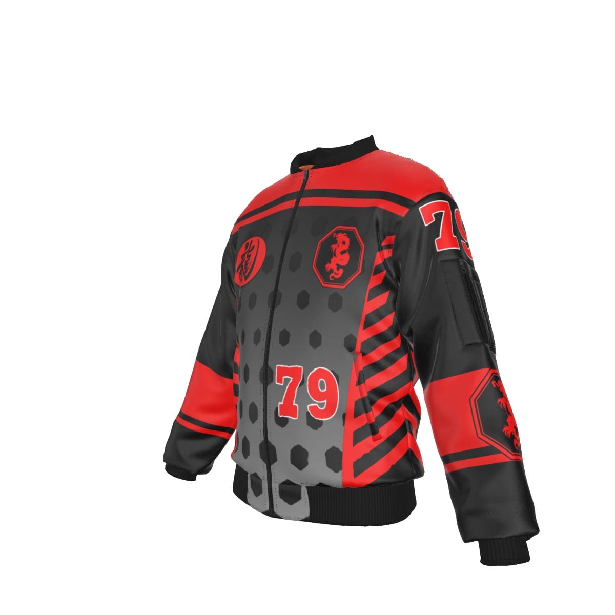 - Black rib-knit, black zipper, pocket with black zipper on left sleeve